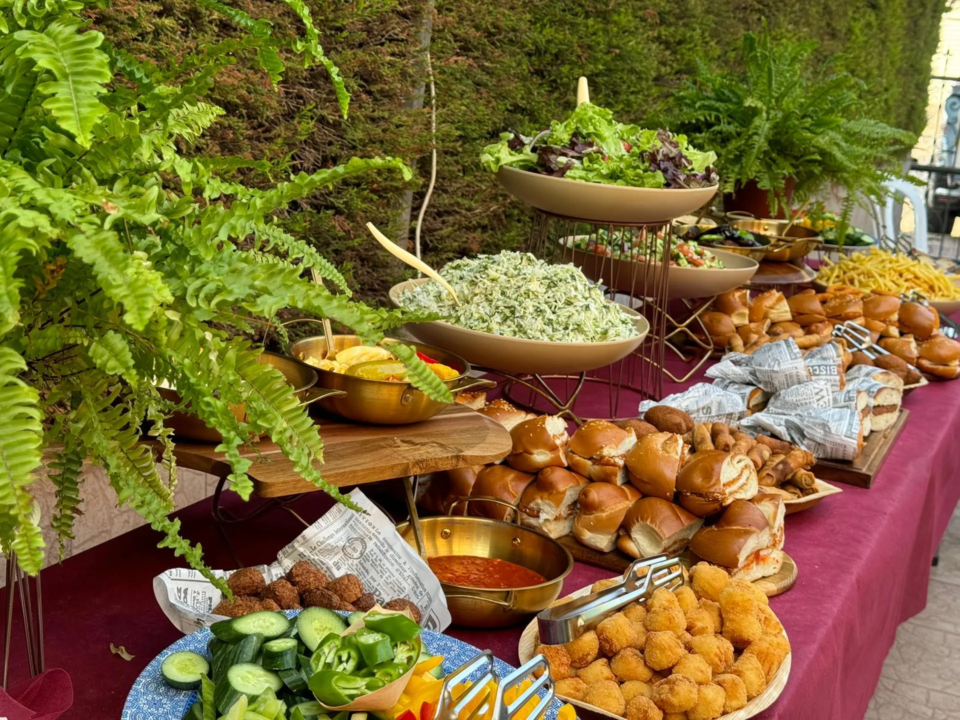 שולחן שוק מרשים עם סלטים, לחמניות ופלאפל